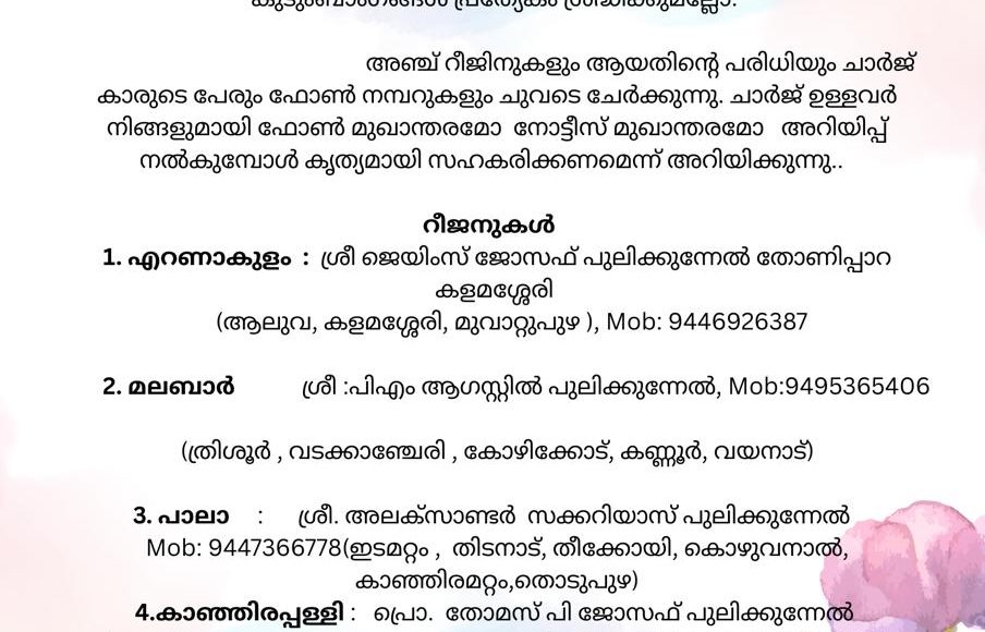 പുലിക്കുന്നേൽ കുടുംബയോഗം റീജനൽ കുടുംബ സംഗമങ്ങൾ അറിയിപ്പ് നോട്ടീസ് ബഹുമാന്യ കുടുംബാംഗങ്ങളെ 2025 ഒക്ടോബർ ഒന്നാം തീയതി കളമശ്ശേരിയിൽ വച്ച് നടന്ന കുടുംബ യോഗത്തിൻ്റെ പൊതുയോഗ തീരുമാനപ്രകാരം, കുടുംബയോഗം സജീവമാകുന്നതിനും, പ്രവർത്തനങ്ങൾ വിപുലീകരിക്കുന്നതിനും വാർഷിക പൊതുയോഗത്തിലും കുടുംബമേളയിലും കൂടുതൽ കുടുംബാംഗങ്ങളെ പങ്കെടുപ്പിക്കാനും, ലക്ഷ്യമിട്ടുകൊണ്ട് പ്രാദേശികമായി കുടുംബസംഗമങ്ങൾ നടത്തുവാനുള്ള ക്രമീകരണങ്ങൾ സംബന്ധിച്ചുള്ള ഈ അറിയിപ്പ് അതാത് റീജനുകളിലെ നമ്മുടെ കുടുംബാംഗങ്ങൾ പ്രത്യേകം ശ്രദ്ധിക്കുമല്ലോ. അഞ്ച് റീജിനുകളും ആയതിൻ്റെ പരിധിയും ചാർജ് കാരുടെ പേരും ഫോൺ നമ്പറുകളും ചുവടെ ചേർക്കുന്നു. […]